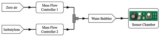 In addition to these tests, the sensor array was evaluated using a gas rig to test the response to a single chemical, isobutylene, at different concentrations. A gas cylinder with a nominal concentration of 50 ppm was diluted with zero air from a zero-air generator (HPZA-7000-220, Parker, Warwick, UK) to concentrations of 2, 4, 6, 8, and 10 ppm using a custom mass flow-controlled gas mixing system. The total flow rate of the diluted gas was set to 300 mL/min and humidity was added using a water bubbler (around 60% RH, measured using the BME680 gas sensor). The test started with 1 hour of zero air, followed by 30-min of increasing concentration steps, with 30-min of zero air between each step. The experimental set-up for the gas rig testing is shown in Figure 7.