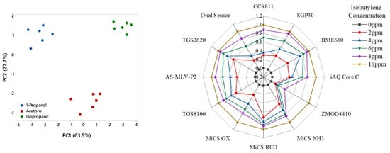 The PCA results are shown in Figure 8 (left) as a score plot. Each sample is presented by a single point, which demonstrates the relations (similarity) between all samples. Points that lie close to each other have similar properties while points that are further away have different properties []. This result demonstrates good separation between the three chemicals with no overlap. The principal components PC1 and PC2 account for over 90% of the variance, which is considered a robust result []. This indicates that the WOLF Breath E-nose has some selectivity at distinguishing between individual chemicals.