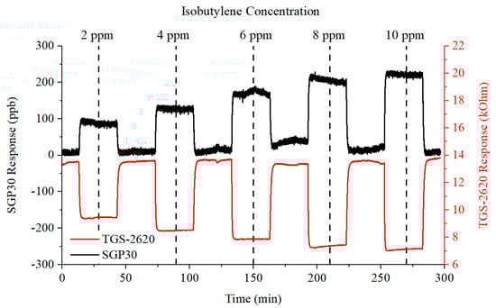 SGP30 and TGS-2620 gas sensor responses to increasing concentrations of isobutylene.