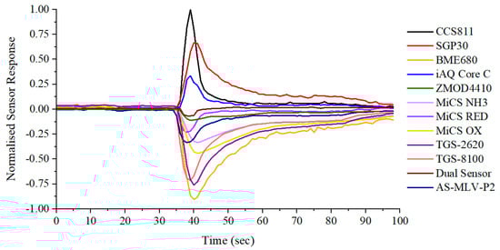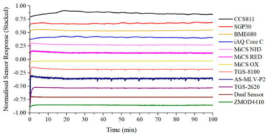 The operating principle of MOX sensors is based on a reduction-oxidation (redox) reaction. In ‘clean’ air, oxygen is absorbed onto the gas-sensitive layer of the sensor (e.g., tin oxide). When exposed to a reducing or oxidising gas, the oxygen reacts to the target gas, which changes the conductivity of the sensitive layer, resulting in a change in current []. The applied voltage is fixed, to measure the change in resistance to characterise the sensor response. Traditionally, the limitations of MOX gas sensors relate to high power consumption and temporal drift [,]. The emergence of MEMS-technology MOX sensors has led to further miniaturisation of sensing chips and heater resistors, which has drastically reduced power consumption. In general, thick film MOX sensors are more stable than MEMS (thin film) devices, however MEMS sensors have faster response times []. To further reduce power consumption, duty cycling using two temperature pulsing can be used. This involves switching between a higher and lower temperature, to reduce baseline drift, decrease response time and power []. For this application, a heating phase of 150 ms was implemented for the analogue MEMS MOX gas sensors.