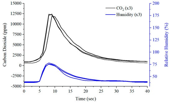 For our volunteer experiments, subjects did not need to exhale until their lungs were as empty as possible. Instead, only four seconds of exhaled breath were required. Subjects were asked to inhale for four seconds, and then exhale normally into the device for around four seconds. This procedure can improve the reproducibility of sampling, as shown in Figure 11. These readings are from the sensor module, embedded in the back-end connector of the sampling tube. Figure 11 demonstrates that using this standardised sampling procedure produces very consistent and reproducible outputs for commonly used sampling parameters, such as CO2 and humidity. This procedure should therefore minimise sampling-related variability in exhaled breath composition. A typical sensor array output response to exhaled breath, from the same subject, is shown in Figure 12.