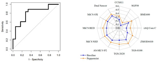 Baseline vs. peppermint exhaled breath samples; (left) ROC curve; (right) Peppermint breath test radar plot of normalised features.