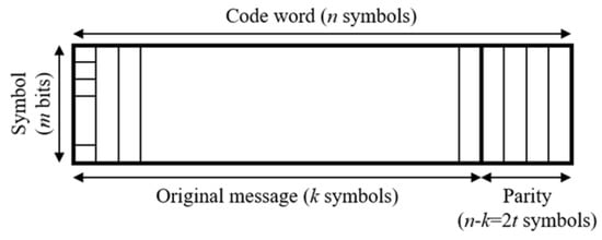 An RS encoded message is composed of a sequence of n symbols (each one of m bits), of which k symbols represent the original uncoded message and the remaining are the added parity []. An example of an encoded message is shown in Figure 1.
