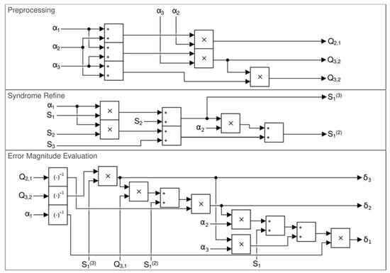 The method presented by Lu et al. [] performs error magnitude computation with less computational effort in respect to the Forney method, as shown in Table 1. It is composed by three main phases, each one performing different operations: preprocessing phase, syndrome refining phase, and error-magnitude extraction phase. In the preprocessing phase, partial results, and , are introduced for convenience, and are defined as follows: