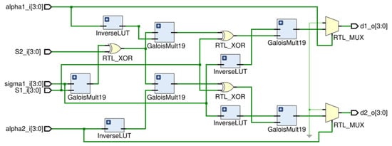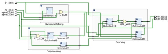 The FPGA platform was used to evaluate the parallelization capability of the two algorithms. For this purpose, the configurations presented in Table 3 for both the Forney and Lu algorithms were designed in full concurrent VHDL code, and results were evaluated in terms of resources’ usage and delay to obtain a valid output. The platform environment is Xilinx Vivado 2019.1 and the target device was set to Artix-7 XC7A100T-CSG324 FPGA. As an example, in Figure 6 and Figure 7, the register transfer level (RTL) results of the RS (15,11) configuration are reported.