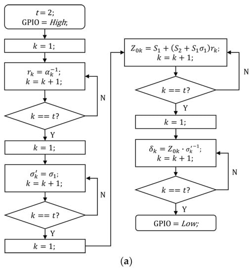 Exploiting the full sequential architecture of an MCU platform, the speed of the two algorithms without parallelization was evaluated. The platform environment in this case is IAR Embedded Workbench, in which the different configurations of Table 3 were coded in C language and flashed on a Texas Instruments (TI) LaunchPad XL development board. The board hosts a TI CC3200 system on chip (SoC) device, with a 32-bit architecture ARM Cortex-M4 MCU clocked at 80 MHz. This device, thanks to an embedded Wi-Fi radio module, is widely used to implement devices and systems compatible with the Internet of Things and wireless sensor network paradigms [,,,,,], topics in which error correction techniques were demonstrated to gain an advantage in recent implementations [,]. Data about execution speeds were collected by measuring a general-purpose input/output (GPIO) pin voltage, which was toggled inside the C code at the computation’s start and end. The time between the low-to-high and high-to-low transitions gives the code execution time. The measurements were carried out by means of a Tektronix MSO 2024 oscilloscope. In Figure 9, the Forney and Lu versions of the C code flow chart for the RS (15,11) configuration are reported.