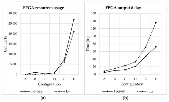 Considering the overall results, it appears that the conclusions drawn by Lu et al. in the paper introducing their method are fully valid only in the case of MCU implementation. In case of FPGA (or in general parallel architectures), the choice between Lu and Forney’s algorithms depends on what optimization strategy has to be followed. If the output delay is a strong constraint, Forney’s method should be preferred, owing to the minor delay required. However, if a circuit with less occupied area is needed, Lu’s method is the better choice.