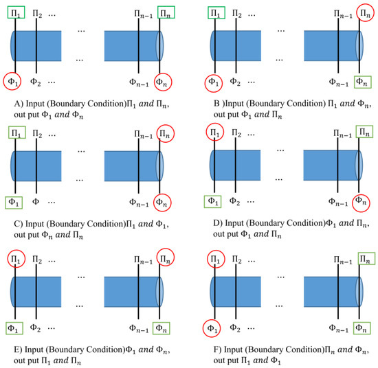 Several numerical methods are available for the solution of Ordinary differential equations (ODEs) Equations (20) and (21). Here the finite-difference approach is used for its simplicity, and because it is suitable for simulation and non-linear observer design [28]. Control variables in the different cases can be presented by the pressures head and flow rates at the beginning and end of the pipe. The solution of the discretized model, using any technique needs boundary conditions that present known values of the variables at the edge of the researched area. Boundary conditions may just be pressures head, just flows, or combining both. The selection of boundary conditions alters the construction of the models, also may change the quantity of equations wherein the discretized model is subdivided. In real systems, boundary conditions can be defined using the elements existing in the hydraulic system. Figure 3 represents the possible boundary conditions in a scheme of a discretized pipeline. We had six cases for the modelling, based on choosing the control variables.