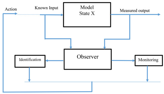 and at the point of the blockage, the flow rates are equal such that and . In Equations (18) and (19), are the pressure head variables and are the flow rate variables. In this work, we aimed to construct observer and controller for the systems stated in Equation (8) as well as Equation (9). A nonlinear model can be expressed as follows
