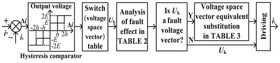 Figure 1 shows the topology of 2-class cascaded H-bridge multilevel inverter, which is connected to RL load. The DC-link voltage of the cascaded unit is E. As shown in Figure 2, the error between the actual value of the output current of the inverter and the reference current is determined by the current hysteresis comparator. The switching states and voltage space vectors of inverter will be selected by the Equations (1)–(3) on the basis of current-tracking error. The “equivalent substitution” of the voltage vector is performed to realize fault-tolerant control in the fault state.