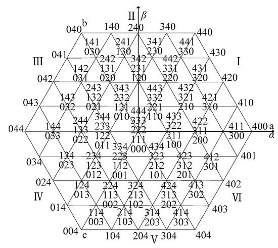 In Figure 2, if the voltage vector Uk = (x, y, z) selected by (1–3) is the fault voltage vector, the non-fault vector with the position coincidence is preferentially selected for equivalent substitution. If there is not, the other non-fault vector whose position and effect are the closest is selected for substitution. Where x, y, and z are integers greater than or equal to 0.