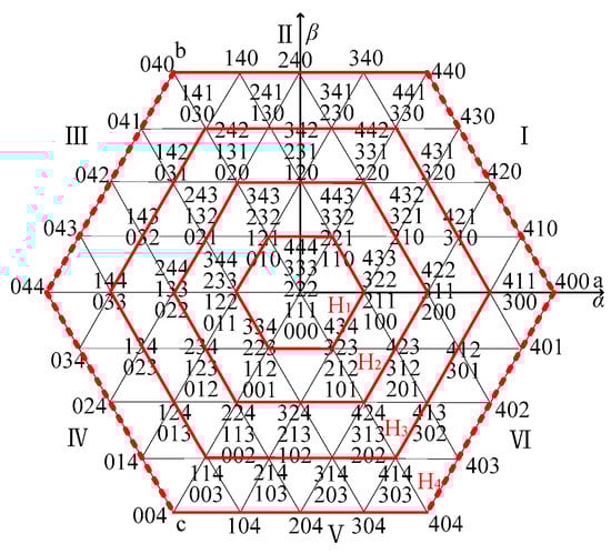 As shown in Figure 4, when one unit in phase A of 2-class cascaded inverter is in fault, the above method is shown in Table 3. There are four regular hexagons in the voltage vector diagram of the 2-class cascaded H-bridge inverter, which are named H1, H2, H3, H4, respectively. Taking the vector “400” as an example, it is located on the outermost hexagon H4 in Figure 4. There is no non-faulty voltage vector with position coincidence to be selected for “400.” The voltage vector “300” should be selected according to Table 3. The switching states of phase A before and after substitution can be seen from Table 1, where “on” represents turn-on, “off” represents turn-off and the switching state of the faulty unit is represented by “×”.