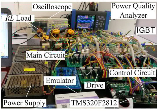 The experimental system of the 2-class cascaded H-bridge multilevel inverter is shown in Figure 5. The method is verified and analyzed by Simulink and experimental system. The power electronic component in the inverter is IGBT. The driving circuit adopts IGBT integrated driving module DA962D and the system main control chip adopts 32-bit DSP TMS320F2812. The tracking reference current of the inverter is sine wave. Its amplitude is 4.5 A and frequency is 50 Hz. The hysteresis width h is 0.2A. The DC-link voltage of the cascaded unit is 24 V. Inverter is connected to RL load with R = 10 Ω and L = 5 mH. In the experiment, the oscilloscope is DS1052E and power quality analyzer is HIOKI PW3198.