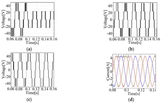 Taking ∆ia ≥ 2h of phase A as an example, it is shown that the current-tracking error of phase A is large and the load current is lower than the reference value and the voltage value 2E should be selected to eliminate the tracking error quickly. The output voltage values of phase B and phase C can be obtained in the same way according to the Equations (2) and (3).