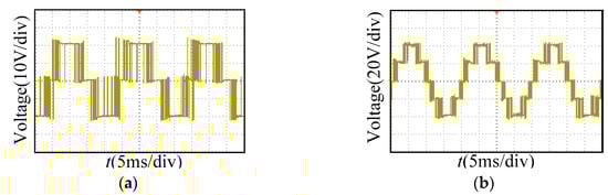The voltage waveforms of phase A and phase B in the fault state are shown in Figure 9a,b. The waveform of voltage of phase C is basically the same as the waveform of phase B, but the phase are mutually different by 120°. It can be seen that the number of the levels of phase A in the fault state is reduced from 5 to 3 levels, which is consistent with the simulation analysis. The number of the levels of phase B remains unchanged and it is still 5 levels. However, compared with the non-fault state, the probability of the levels of 2E and −2E is larger. The reason is that the states “0” and “4” cannot appear in phase A because of the fault. The probability of the states “0” and “4” in phase B and phase C increases in the process of voltage vector equivalent substitution. For example, the voltage vector selected before the fault is “411” and the fault of phase A causes the vector to become the fault vector. At this time, the coincident vector “300” is selected by the fault-tolerant algorithm for equivalent substitution, which directly causes the output voltage of the phase B and phase C to change from the original −E to −2E. So the probability of the levels of 2E and −2E becomes larger in phase B and phase C.