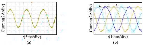 Figure 10a,b shows the experimental waveforms of currents ia and iabc in the fault state. They are close to the sinusoidal current waveform with an amplitude of 4.5 A and a period of 50 Hz. It is proved that the actual current value can accurately track the reference value with this method and the fault-tolerant control is effective in fault state. The voltage and current waveforms in the experiment are basically consistent with the simulation results. However, because of the time delay caused by digital control, the distortion of the experimental waveforms is slightly larger than the simulated waveform.