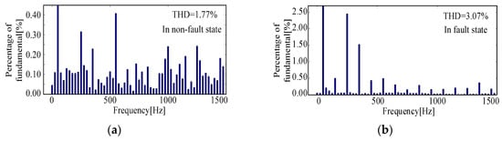 It can be seen from Figure 11 that the total harmonic distortion rate of the current in phase A before the fault is 1.77% (Figure 11a) and which is 3.07% (Figure 11b) after the fault. The results of phase B and phase C are basically the same as phase A. It is proved that this method can realize fault tolerance control.