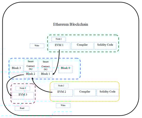 A transaction group in blockchain networks is combined into blocks of transactions connected in the chain using the hash of the previous block’s record [30]. Therefore, as a property of immutability, the basic security feature of blockchain networks is enforced [31]. The further the block is along the chain (the older it is), the more the data included in it is protected from changes [32]. If an attacker tries to change any of the keys, the local register will immediately cease to be valid because the hash values inside the next blocks headers will be completely different depending on the hash function mechanism [33,34].
