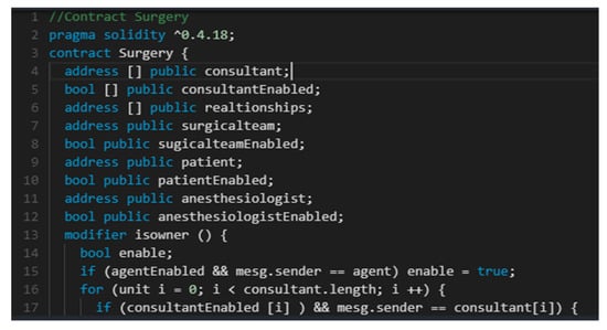 The process associated with surgery can be a huge burden in a busy clinic. The EHR Surgical Workflow System meets the needs of busy practices and turns a complex process into an all-in-one step-by-step, streamlined workflow. The practice can be made fully integrated via Ethereum blockchain smart contracts EHR Surgical Workflow system. This allows administrators, billing, front desk and other tasks to complete tasks to support the workflow from pre-operative patient management to post-operative patient management. The details are then inserted seamlessly into the prior surgical record of the patient. Through the smart contract features it would be possible to record patient consent and initial assessment of the patient. Our workflow consists of various activities that are involved throughout the surgical patient process. This includes pre-approvals, medical clearance, surgery scheduling, pre-operative testing and recording consent. Throughout the process, the visit is recorded, treatment is reported and paid. This would be useful to review past surgical cases or surgeries that have been canceled. Algorithmic workflow and the solidity smart contract components can be seen in Figure 8 and Figure 9 respectively.