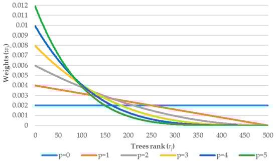 where is the rank of the j-th tree, p is the exponential parameter describing the strength of the weights. All weights are normalized and, in consequence, sum up to 1. An example of weights’ influence on the final probability (Equation (3)) inducted by the parameter p is presented in Table 3 and Figure 1 below.