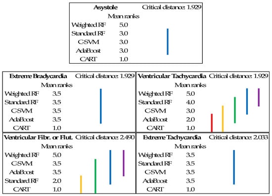 Finally, in order to assess whether differences in Score measures for all methods presented in Table 9 are statistically significant, we have used Nemenyi post-hoc tests [] (test is performed by taking into account each of the -folds). This is a post-hoc test intended to find the groups of data that differ after a statistical test of multiple comparisons (such as the Friedman test) has rejected the null hypothesis that the performance of the comparisons on the groups of data is similar. The test makes pair-wise tests of performance. Moreover, for a better understanding of the results the Critical Difference (CD) diagram depicted in Figure 2 has been created. This diagram provides an interesting visualization of the statistical significance of the observed paired differences between a set of models on a set of different datasets (i.e., dataset for each arrhythmia type). It allows one to compare all of the models against each other on these datasets and check the results of all these paired comparisons.