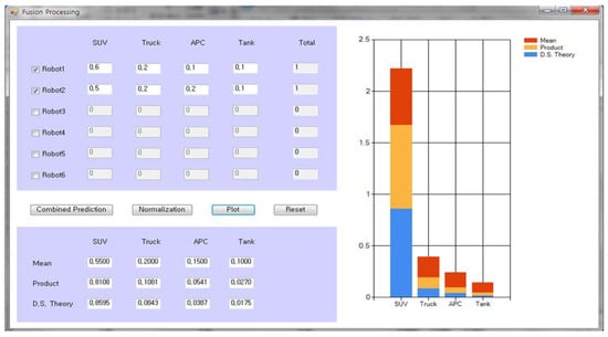 An individual fusion process was implemented using the aggregation operators of mean, product, and DS theory, as depicted in Figure 1. As shown in the left upper part of Figure 1, up to six military robots can be selected, i.e., from Robot1 to Robot6, and the possible types of a specific target that they monitor include a sport utility vehicle (SUV), a truck, an armored personnel carrier (APC), or a tank. Given input values of confidence for each type of target, the combined prediction button calculates the fusion of confidence values according to (1) using three fusion operators. The normalization button returns a normalized output value, which is computed by (2), as shown in the left lower part of Figure 1. The plot button displays a graph whose bar represents the accumulated confidence values on each type of target, as shown in the right side of Figure 1. The reset button initializes the fusion processing. These buttons are displayed in the left middle part of Figure 1.