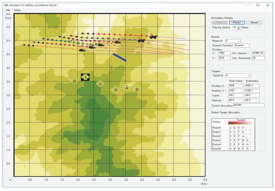For the target identification and coordination of surveillance robots, we designed and developed an integrated simulator. A unit simulator for data fusion, as depicted in Figure 1, was plugged into the integrated simulator, which included the task of rational coordination for target allocation. The intelligent simulator for data fusion and target allocation in Figure 3 consists of the information panel of the surveillance robot agents and moving targets, and the scenario display panel. The scenario panel presenting the interaction of the agents and targets displays a group of targets with four different types and their route, the multiple robots equipped with infrared sensors, and obstacles denoted by bars. The right panel of the simulator displays the information about the robot agents and targets. In its top of the panel, there are three simulation modes: Start, Pause, and Reset, and the playing speed can be up to 10 times faster than the original speed. Below the simulation modes, robot information is listed. The parameters are robot ID from 0 to 5, search or tracking mode, position, sensors, and a threshold value switching search mode into tracing mode. Regarding target information, the parameters are target ID from A to F, the real values and estimated values of position, types, velocity, and fusion accuracy in two columns. The bottom of the right panel describes robot–target allocation determined by the robots’ coordination. In this scenario, there are six surveillance robots, six identified moving targets, and a specific obstacle. The surveillance robots perceive information through sensors and generate probabilities and utilities, which are then used to optimize target selection that maximizes their total expected utilities, as described in (4). From each robot’s perspective, the leftmost column in the table displays the best appropriate target being tracked in each given state. As states evolve, each column is shifted to the right direction.