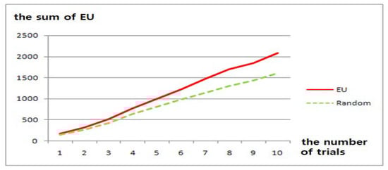 After the 100 total trials for the 10 scenarios, the accumulative sum of expected utilities computed by our agent’s target selection was higher than that of the agents using the random strategy. The more accurate target allocation of robots R and targets T with the number of robots m and the number of targets n, as described in (4), allowed our decision-theoretic agents to dynamically choose their appropriate targets in real time. We found that the difference between the performance of agents with two different strategies for target allocation was clearer when the number of surveillance robots and the number of targets increased from two robots and two targets to four robots and four targets. This experimental result showed that the performance of the robot using a random strategy was inferior to that of our agent as the complexity of situations increased.