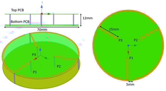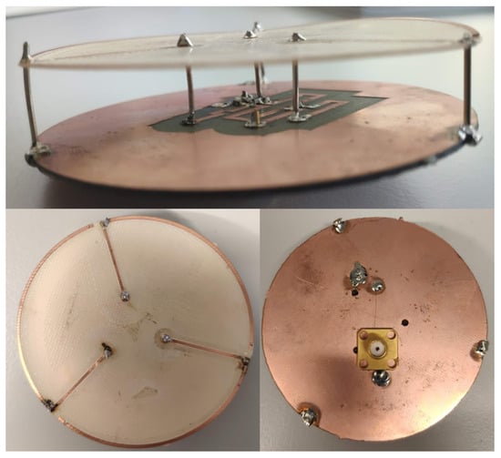 The proposed concept has been fabricated on a low cost substrate that is 1.6 mm-thick FR4 Epoxy with the and . The different views of the antenna are shown in Figure 8. The radiating elements are placed at the top board that connect to the feeding circuit and the ground plane at six points by using the 1mm diameter metallic wires. The three inner points link to the three output ports of feeding circuit, while the three outer points are shorted to the ground plane.