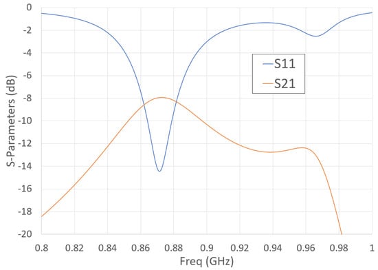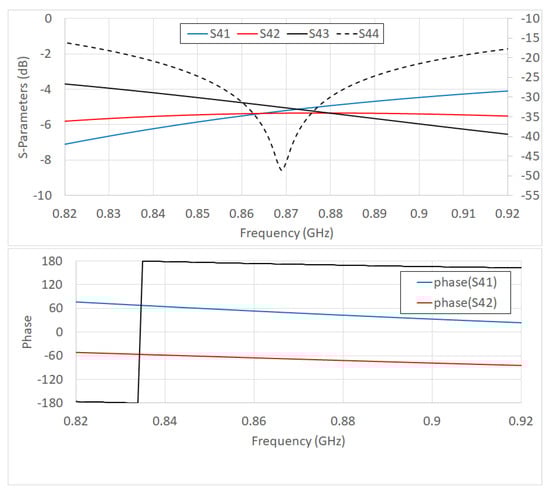 The value of capacitor is chosen to reflect one-third of the signal at 868 MHz; thus a capacitance of 5.1 pF is required and it provides a reflection phase of 124. Transmission of the QLQC is extracted from [18]. Phase at 868 MHz is −34. Phase at 868 MHz is −124. is tuned to provide a −30 phase shift at 868 MHz. From Equation (2), must provide a phase shift of −57. A feeding line ( = −30) is also added on port 4 to access to the coupler