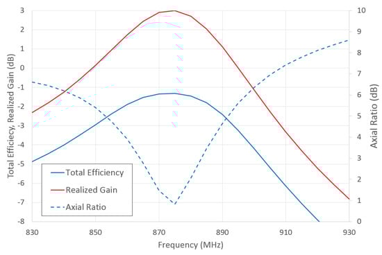 Total efficiency, peak RHCP Gain, and broadside axial ratio versus frequency.