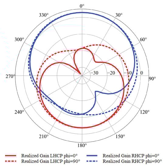 Thanks to the studies in the previous sections, the final structure consists of a tri-fillar antenna and a feeding network. The simulated total efficiency of the CP mode is 69% ( −1.5 dB) at 868 MHz. From the different models with and without losses described in Table 1, it is possible to find that 0.65 dB are due to dielectric loss and 0.7 dB to conductivity loss.