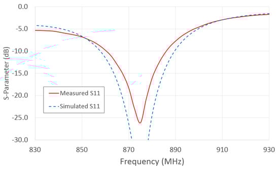 The reflection coefficient of the prototype was measured. A comparison with the simulation in Figure 9 shows a small disagreement. Because of the fabrication issue, the bandwidth of the measurement results was much smaller than the simulation. However, considering a −10 dB S11 criteria, a 27 MHz frequency bandwidth from 860 to 887 MHz was obtained that is suitable for the application. The 3D radiation pattern was measured using near-field StarLab station from Satimo. The antenna had a total efficiency of −1.7 dB at 868 MHz, as presented in Figure 10. The measurement shows a peak RHCP gain of 3 dBic at 868 MHz and a 50 MHz (844–894 MHz) −3 dB RHCP Gain frequency bandwidth. Moreover, a 14 MHz −3 dB axial ratio bandwidth was obtained in the broadside direction. Finally, the radiation pattern at 868 MHz presented in Figure 11 confirms that a −3 dB beamwidth of 117 was obtained.