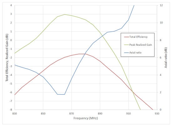Realized gain, total efficiency, and axial ratio versus frequency.
