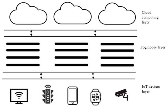 For deployment in the IoT network, fog computing adopts the three-layered architecture [8], which consists of the cloud layer, fog nodes layer, and the IoT device layer as shown in Figure 1. The fog nodes layer is positioned between the cloud layer and the IoT devices layer. It comprises nodes such as routers or gateways, switches, base stations, servers or dedicated computer systems, etc. It serves as a complement to the cloud layer by performing the required computations, storage, and other services traditionally done by the cloud. It receives data from the IoT devices in the IoT devices layer and performs the processes required by users without using the cloud. The cloud layer comprises high-end servers which host different IoT applications. It serves as the universal manager of the applications.
