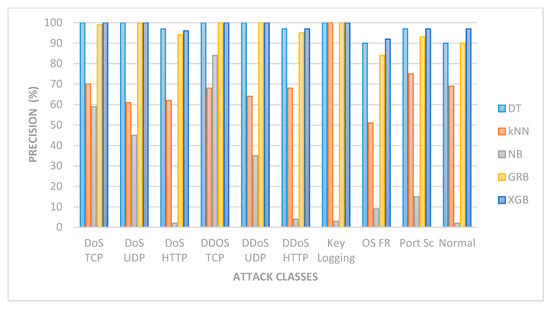 Figure 11 presents the precision of the classifiers in multiclass classification. The XGBoost, gradient boosting, and DT classifiers achieved a precision of 84–100% in all the attacks and normal instances. The k-NN and NB achieved a precision 2–70% in all the attacks and normal instances with the exception of DDoS TCP attacks, where NB recorded 84% and keylogging attacks, where k-NN recorded 100%.