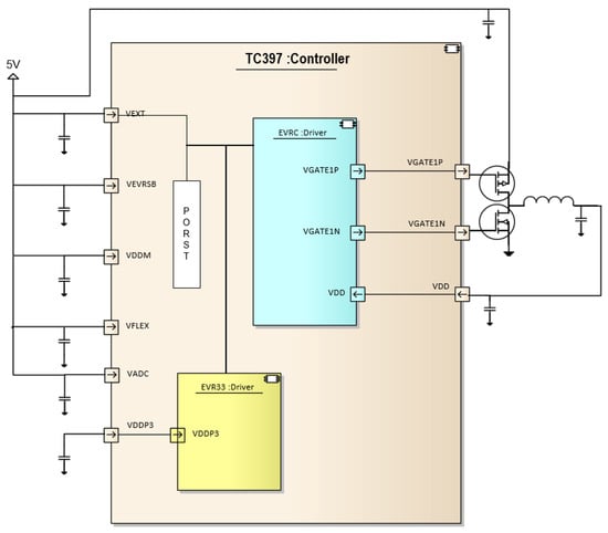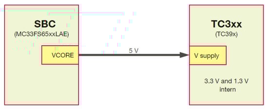 The 5 V signal provided by the SBC is the unique supply of the microcontroller, as can also be seen in Figure 8. It directly supplies the embedded voltage regulators for core and flash supply (EVRC and EVR33). It supplies the analog ports (VDDM and VADC), the flexible ports (VFLEX, configured to be supplied from 5 V and not from 3.3 V), and the embedded voltage regulator in standby mode (ERVRSB). It is important to mention that the supply mode selection is done in an external hardware configuration. The microcontroller contains dedicated pins called HWCFG_x for this purpose. At the HWCFG_1 pin, corresponding to port P14.5, EVR33 is enabled or disabled at startup. At the HWCFG_2 pin, corresponding to port P14.2, EVRC is enabled or disabled at startup. The enabled function is selected in this design by adding pull-up resistors externally in order to have a logic 1 on the input ports.
