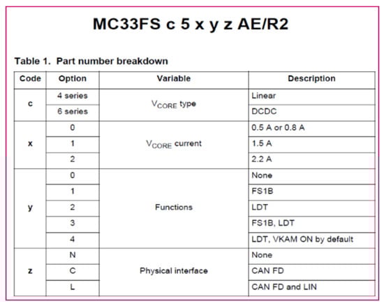 For the SBC, the pre-regulator (VPRE) is configured to be a non-inverting, buck–boost type DC-to-DC converter, and the core output (VCORE) is configured to incorporate a buck topology. A linear topology is also available, but in the current case, the scope is to minimize energy consumption through the DC-to-DC switching regulator. The VCORE is 5 V, representing the main supply for the microcontroller. It also supplies other safety-relevant circuits. The total current consumption was calculated and considered at a maximum value of 1.5 A. For communication, a physical interface with integrated CAN FD and LIN transceivers was chosen. A long duration timer (LDT) was enabled to check the SBC in power off mode. As can be seen in Figure 2, the ordering code of the SBC component is MC33FS6512LAE/R2 [13,14,15].