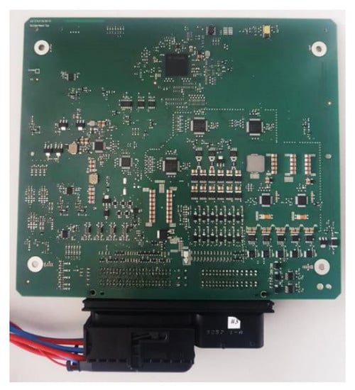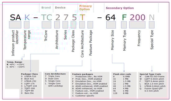 For the microcontroller, the second generation of the Infineon AURIX family, the TC397 microcontroller, is considered. The ordering code for the microcontroller is SAK-TC397TP-64F200N. This nomenclature, as shown in Figure 3, corresponds to a production device with a temperature range from −40 °C up to 125 °C, with board assembly recommendations (BGA) package 292, which consumes below 2 W, a triple core running at 200 MHz, support for floating and fixed-point operations, a 4 MB flash size, and CAN FD communication [16].