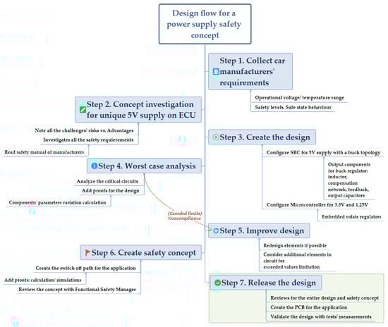 The paper is organized as follows. Section 2 discusses design challenges related to safety operation for a novel concept of a safety-relevant power supply with only 5 V for the main component from an ECU, the microcontroller. In order to prevent and limit design difficulties and challenges, a design flow procedure is proposed in Section 3. In Section 4, special attention is paid to getting proper values of the 5 V regulator components by analyzing the SBC and microcontroller requirements, in terms of safety supply. The selection of components is proved by performing worst-case analysis to accomplish the hardware robustness target. Section 5 deals with the enhanced features of the microcontroller and power SBC, in terms of power management, to guarantee a safe state by switching off the entire system in case of supply faults. Accordingly, a complete safety switch off path (SWOP) circuit is proposed for a printed circuit board (PCB) schematic. Finally, Section 6 draws conclusions and proposes future research work.