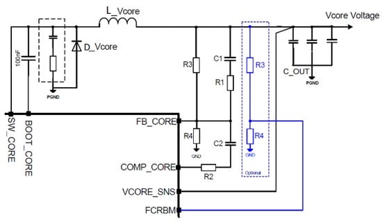 Usually, the components’ datasheets tell only one part of the story and recommend generic (typical) values for the components, as can be seen in Figure 6. It is necessary to highlight that when working with safety-critical design, all hardware designers shall add proofs for the design and not take the manufacturer’s stated output capabilities for granted. Therefore, in this paper, for the proposed concept, the authors added proofs and considered a worst-case scenario for buck inductor (LCORE) and compensation network (R1/C1/R2/C2) selection. The component selection must be done in such a way that the SBC should provide output voltage (output power) with some safety margin on top, in terms of stability.