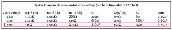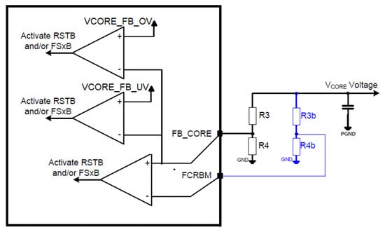 The maximum, rated, and minimum VCORE computed values are in correlation with the feedback directional sensitivity circuit of the FS6152 supply (VCORE_FB). Therefore, the undervoltage and overvoltage feedback values (VCORE_FB_UV; VCORE_FB_OV) were extracted from the manufacturer specification and introduced in a Mathcad tool as listed in the below formula:
