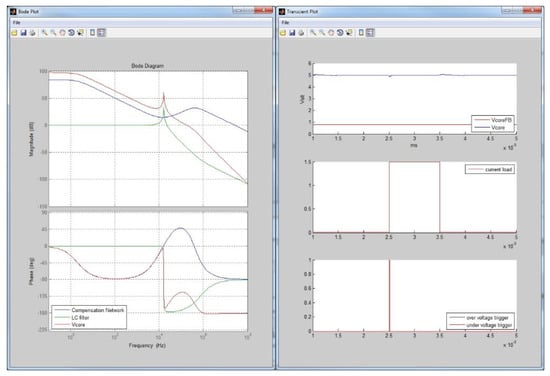 Taking into consideration this coil value, the maximum output current of 1.5 A, the 5 V output voltage, and by using the Graphical User Interface (GUI) provided by NXP to check the converter stability, plots for transient and Bode characteristics were evaluated in order to obtain the right values from the compensation network. Considering the following values—C1 = 330 pF, R1 = 1.1 kΩ, C2 = 100 pF, R2 = 47 kΩ—it can be stated that the control loop was properly compensated. Figure 7 shows a simulated Bode plot with a sufficient phase margin around 55 °C and a gain margin of −20 dB.