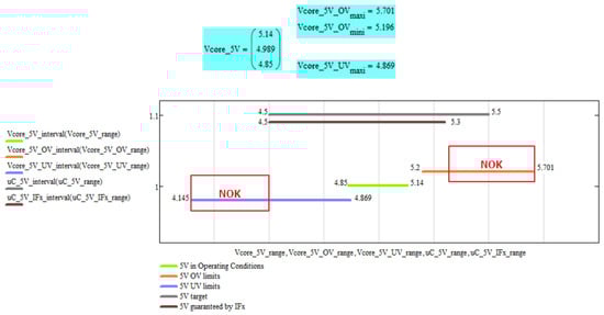 The results of the above calculus represent, basically, the best approach to predict the under and overvoltage 5 V supply faults in the circuit. As can be derived from Figure 9, the normal operation is ensured within the range of 4.85–5.15 V. The main drawback occurs in the detection range of the undervoltage and overvoltage monitored behaviors. From the plot in Figure 9, it can be seen that the detection is significantly out of range. In the case of undervoltage detection, a power-on reset can be generated. The critical point represents overvoltage detection when the microcontroller could be damaged completely. From this moment, it is clear that the design needs improvements in order to operate properly and safely. There are two options, and the first one is to use components with better performance. However, in this case, 0.1% resistors were already used, despite the fact that the SBC manufacturer specifies 1%. The remaining option is to add to the design a specific circuit which could limit or switch off operation when the VCORE voltage goes higher than 5.3 V. A proposed voltage supervisor component is TPS3702-DX50Q1. It generates a safe state activation or reset when the voltage is higher than 5.3 V.