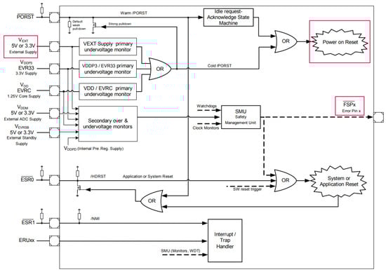In order to fulfill technical safety requirements, the TC397 microcontroller has a PMS (Power Management Systems, as shown in Figure 11) module, which implements software with staggered voltage monitoring. The PMS is built upon a primary and a secondary monitor, providing adequate redundancy to activate the safe state in case of under or overvoltage faults. The primary monitoring circuit can generate only an undervoltage detection for the following voltages: 5 V, 3.3 V, and 1.25 V. In case of undervoltage detection, in the primary monitoring unit of the PMS, a power-on reset will be generated. In the secondary monitoring block, both functions of under and overvoltage protection are implemented. In case of detection in the secondary monitoring unit of the PMS, the SMU (Safety Monitoring Unit) will generate an alarm on the error pin (FSPx, the fail-safe pin). Detection thresholds can be set in the software code via SWDUVVAL/SWDOVVAL bits in the PMS_EVRUVMON/PMS_EVROVMON registers. The signal provided by the microcontroller at the FSP pin shall be part of the switch-off concept.