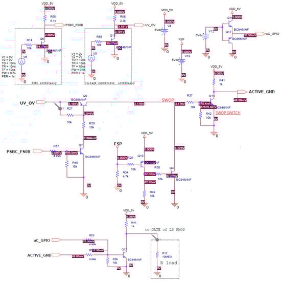 As listed in Step 6 of the design flow proposed in Section 2, before releasing the concept by the functional safety manager and stating the PCB manufacturing, it is mandatory to add proofs for proper functioning of safety activation using redundant logic. An OrCAD PSpice simulation of the circuit was performed, considering all four redundant signals (UV_OV, FS0B, FSP, uC_GPIO), as is depicted in Figure 13. For the FS0B and UV_OV signals from the voltage monitoring circuit, the internal open drain structure was emulated. Because the SWOP concept chosen is to switch off, an intermediary signal, called ACTIVE_GND, is considered. The function of this signal is as follows: only when ACTIVE_GND is low (0 V) and the uC_GPIO pin is low can the gate of the bridge switches (LS- low side MOSFETs) used in actuation be controlled. When a fault is raised by the FS0B, FSP, or UV_OU signals, ACTIVE_GND goes to a high level, which leads to the actuation switching off (gate pulled to the ground). After compiling the simulation for all cases and combinations of signals (low and high levels for each signal), the SWOP concept was released.
