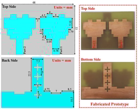 The design and prototype models of the proposed UWB MIMO antenna system are presented in Figure 1. The system is designed on an FR4 substrate with a thickness of 1.6 mm. The dielectric constant of the substrate is assumed to be . The top side includes two radiating stepped-shaped elements with a 50 feed line. The stepped shape is designed to increase the path for the flow of current. By increasing the path for the current, a wide bandwidth is achieved. The two rectangles are designed at the top of each element to achieve wide-band matching. A rectangular ground plane with a rectangular slot is designed at the back side of the substrate. The antenna elements share a common ground plane. The upper edge of the common ground is stepped and incorporated with the plus-shaped slotted stubs to improve isolation between the antenna elements. The stubs act as a bandstop filter for the desired frequency range. It produces transmission zeros within the radiating elements that in turn disturb the flow of current, surface waves, and near fields. The dimensions of the antenna elements, slotted stubs, ground plane, and feed lines are shown in Figure 1.