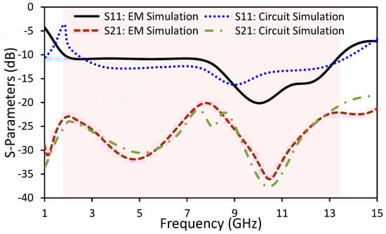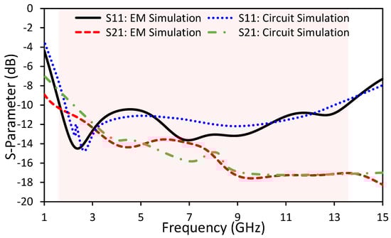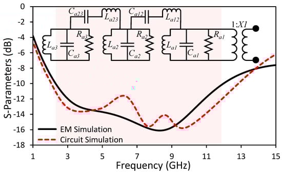Lumped element equivalent circuit model ( = 295 , = 54.45 , = 60 , = 3.45 pF, = 3.82 pF, = 4.8 pF, = 1.55 nH, = 7.42 nH, = 3.85 nH, = 0.6 nH, = 1.5 pF, = 0.7 nH and = 1.22 pF) and comparison of EM and circuit model results.