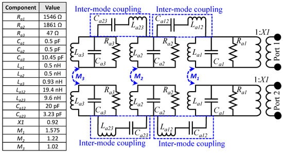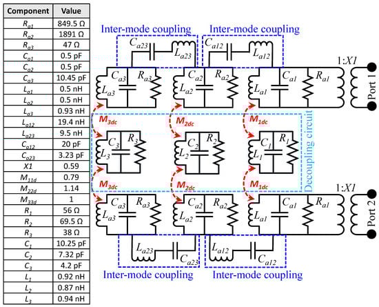 In this section, the equivalent circuit model for slotted stubs is presented. The slotted stubs are added within the antenna elements at the ground plane side to reduce the mutual coupling between the antennas, suppress the surface waves and near fields. To model accurately the proposed MIMO antenna system with the decoupling structure, the same assumptions regarding the radiating modes and inter-mode coupling are considered. In other words, three radiating modes and corresponding inter-mode couplings are modeled for the radaiting structures. The radiating modes are modeled by the combination of RLC circuits, transmission lines are modeled by impedance transformers, and inter-mode coupling is modeled by LC-tank circuits. Since the mutual coupling can be reduced by a band stop response by introducing transmission zeros within the operating range. The decoupling structure is modeled by the combination of RLC circuits. These RLC circuits are coupled with the radiating modes by , , and coupling ratios. By using the coupling structure, the isolation for the proposed system is well below 20 dB for the whole bandwidth. The value of each component and the equivalent circuit model are depicted in Figure 6. The simulated results of the EM model and the circuit model are in good agreement, as shown in Figure 7.