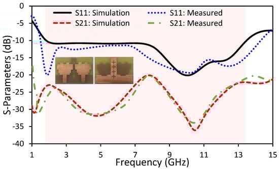 The proposed MIMO antenna system with an isolation network was fabricated using the LPKF machine. The system was measured using a two-port vector network analyzer. The radiation patterns were measured in an anechoic chamber. By introducing the decoupling network, key performance parameters of the antenna were not affected. The simulated and measured S-parameters results for the proposed system are shown in Figure 8. The results were in good agreement. It can be seen that the isolation between the radiating elements was below dB within the whole operating range.
